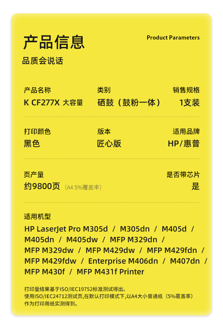 商品标题:科思特(KST)兼容K CF277X 匠心版大容量硒鼓(鼓粉一体)黑色(适用惠普M305d/M305dn/M405d/M405dn/M405dw/MFP M329dn)打印页数:9800页(单位:支)