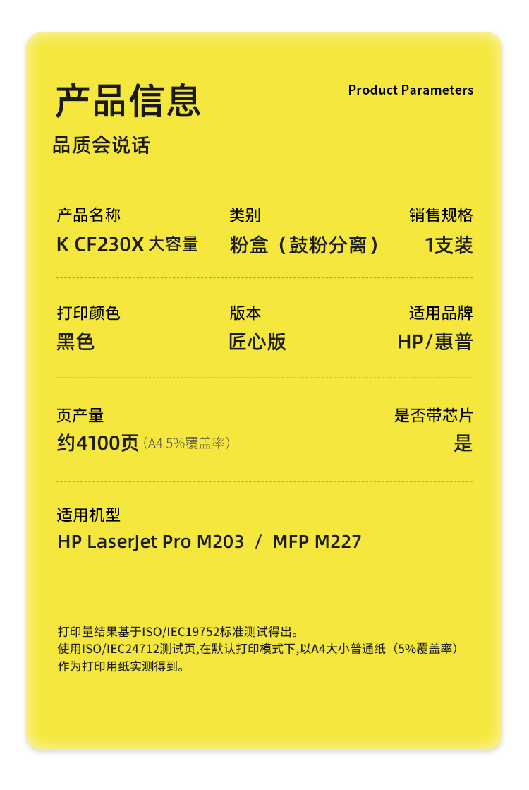 商品标题:科思特(KST)兼容K CF230X 匠心版大容量粉盒(鼓粉分离)黑色(适用惠普M203/MFP M227)打印页数:4100页(单位:支)