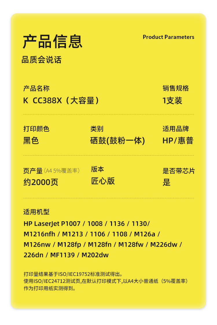 商品标题:科思特(KST)兼容K CC388X 匠心版大容量硒鼓(鼓粉一体)黑色(适用惠普P1007/1008/1136/1130/M1216nfh/M1213)打印页数:2000页(单位:支)