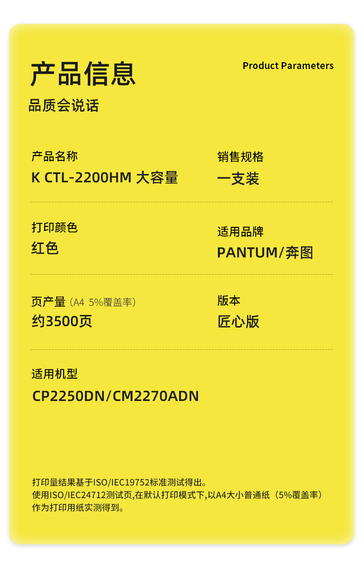 商品标题:科思特(KST)兼容K CTL-2200HM 匠心版硒鼓(鼓粉一体)红色(适用奔图CP2250DN/CM2270ADN)打印页数:3500页(单位:支)