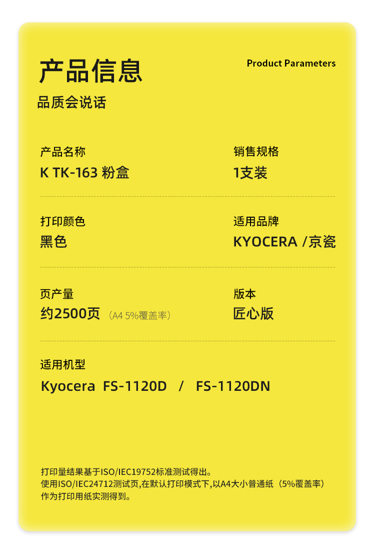 商品标题:科思特(KST)兼容K TK-163 匠心版粉筒(鼓粉分离)黑色(适用京瓷FS-1120D/FS-1120DN)打印页数:2500页(单位:支)