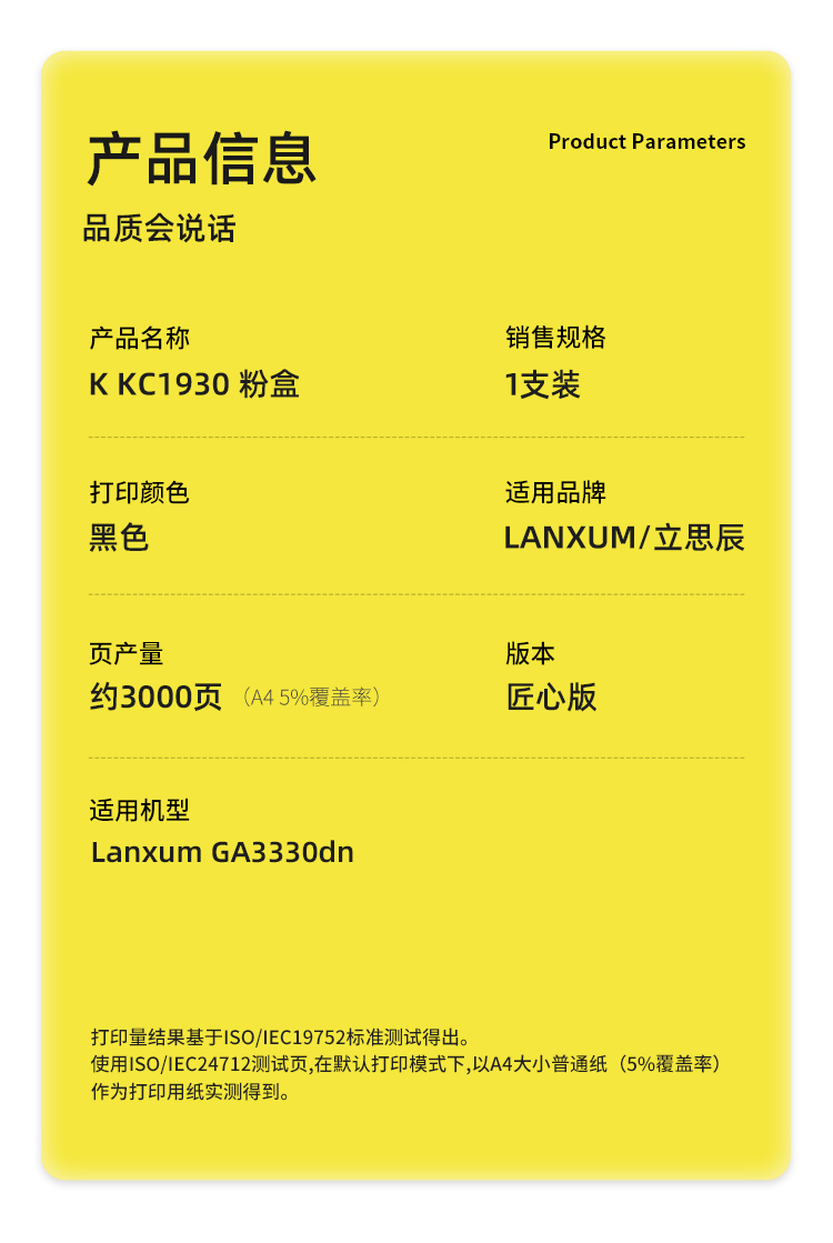 商品标题:科思特(KST)兼容K KC1930 匠心版粉盒(鼓粉分离)黑色(适用立思辰GA3330dn)打印页数:3000页(单位:支)