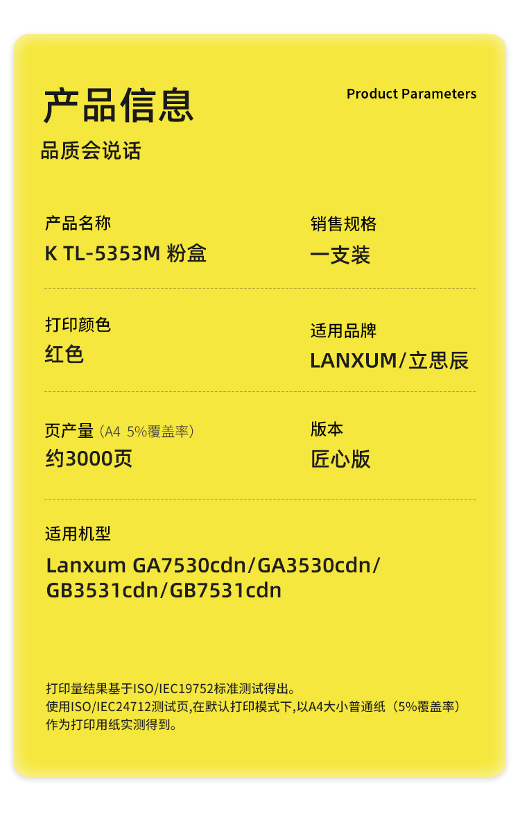 商品标题:科思特(KST)兼容K TL-5353M 匠心版粉盒(鼓粉分离)红色(适用立思辰GA7530cdn/GA3530cdn)打印页数:3000页(单位:支)