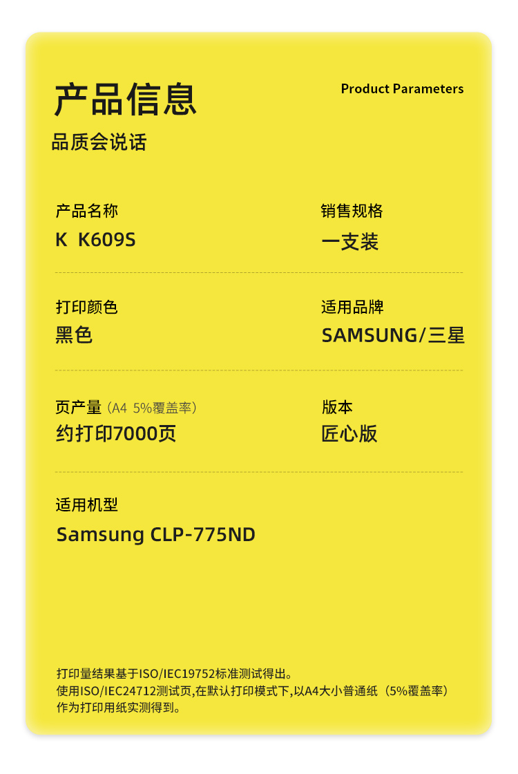 商品标题:科思特(KST)兼容K K609S 匠心版硒鼓(鼓粉一体)黑色(适用三星CLP-775ND)打印页数:7000页(单位:支)