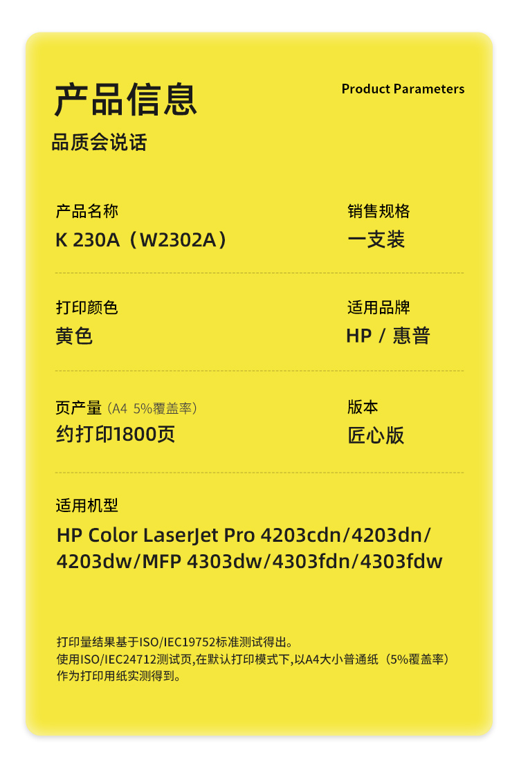 商品标题:科思特(KST)兼容K 230A(W2302A) 匠心版硒鼓(鼓粉一体)黄色(适用惠普4203cdn/4203dn/4203dw)打印页数:1800页(单位:支)