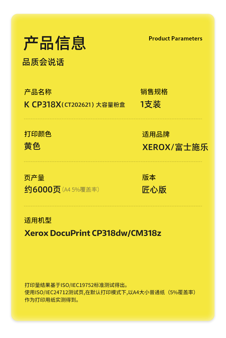 商品标题:科思特(KST)兼容K CP318X(CT202621) 匠心版大容量粉盒(鼓粉分离)黄色(适用富士施乐Xerox DocuPrint CP318dw/CM318z)打印页数:6000页(单位:支)