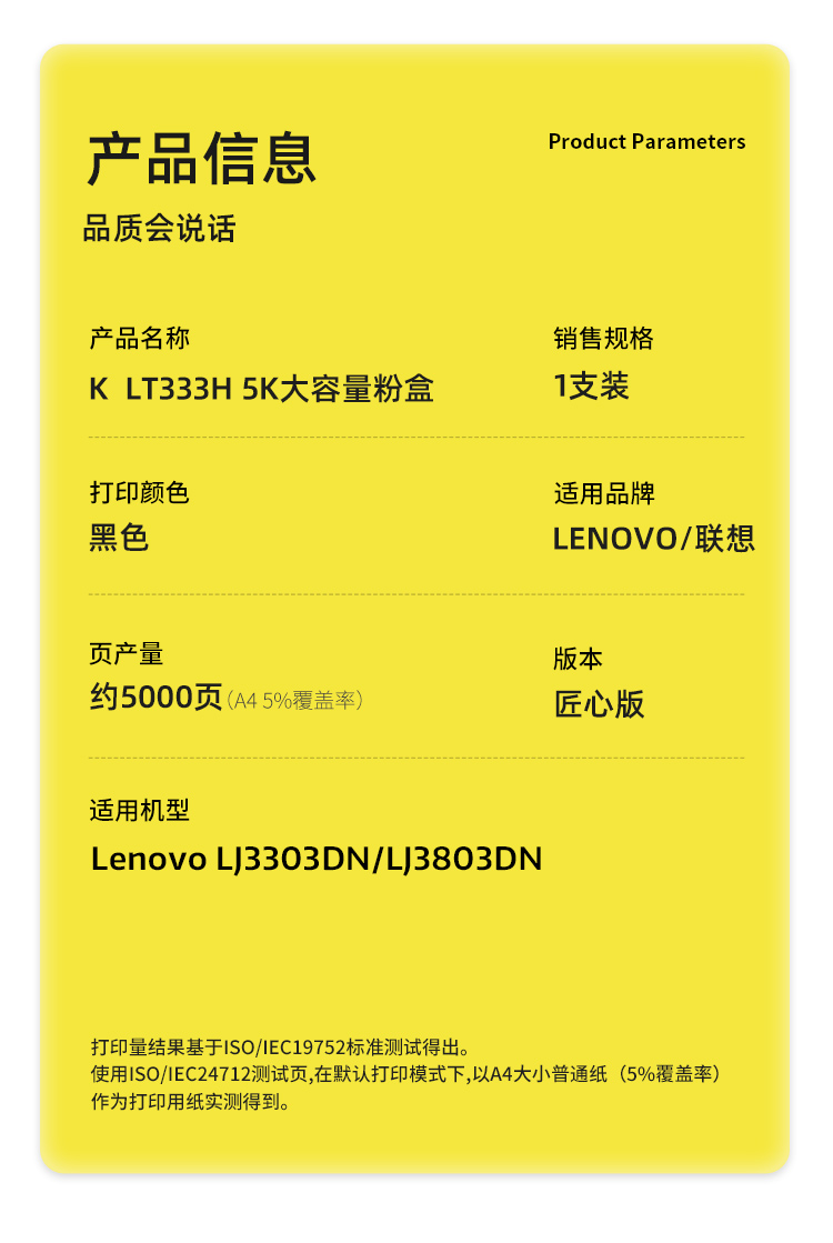 商品标题:科思特(KST)兼容K LT333H 匠心版大容量粉盒(鼓粉分离)黑色(适用联想LJ3303DN/LJ3803DN)打印页数:5000页(单位:支)