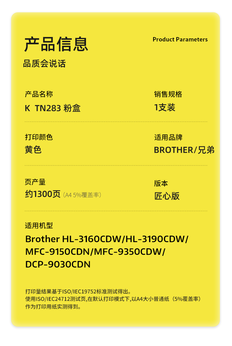 商品标题:科思特(KST)兼容K TN283Y 匠心版粉盒(鼓粉分离)黄色(适用兄弟HL-3160CDW/HL-3190CDW)打印页数:1300页(单位:支)