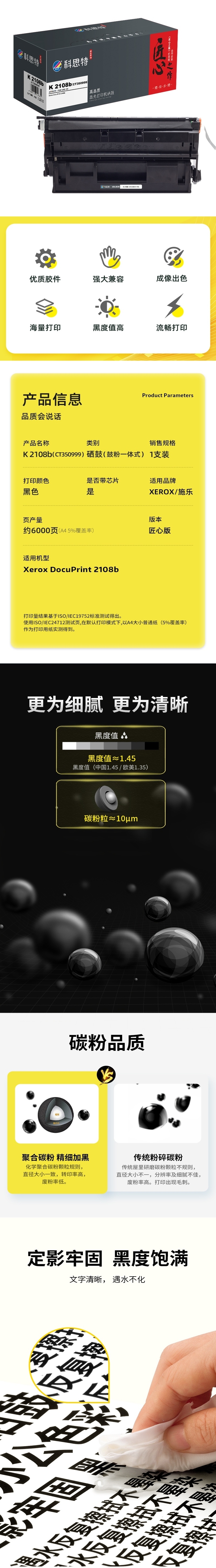 商品标题:科思特(KST)兼容K 2108b(CT350999) 匠心版硒鼓 黑色(适用富士施乐Xerox DocuPrint 2108b)打印页数:6000页(单位:支)