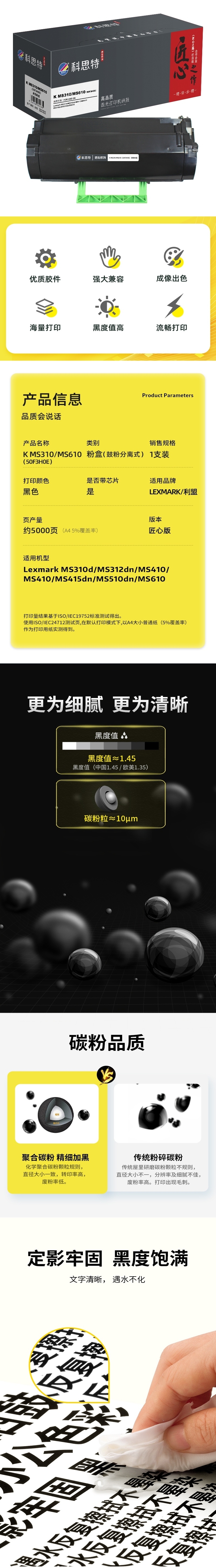 商品标题:科思特(KST)兼容K MS310/MS610(50F3H0E) 匠心版粉盒 黑色(适用利盟Lexmark MS310d/MS312dn/MS410/MS410/MS415dn/MS510dn/MS610)打印页数:5000页(单位:支)