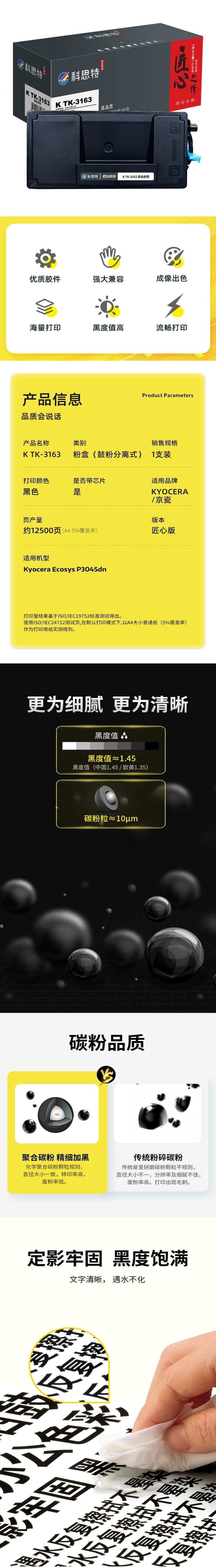 商品标题:科思特(KST)兼容K TK-3163 匠心版粉盒 黑色(适用京瓷Kyocera Ecosys P3045dn)打印页数:12500页(单位:支)