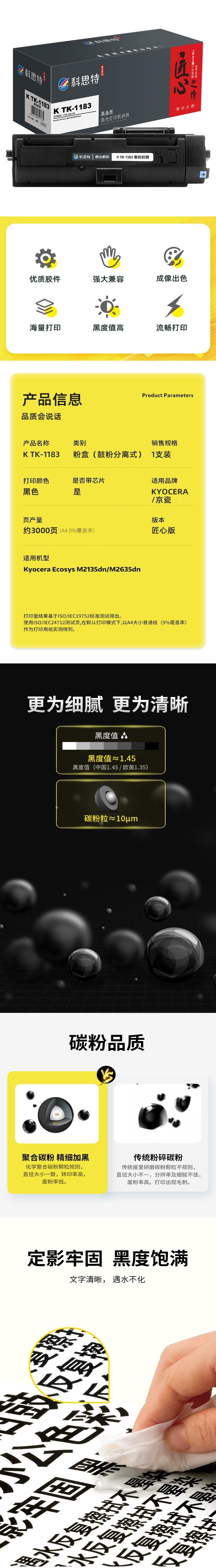 商品标题:科思特(KST)兼容K TK-1183 匠心版粉盒 黑色(适用京瓷Kyocera Ecosys M2135dn/M2635dn)打印页数:3000页(单位:支)