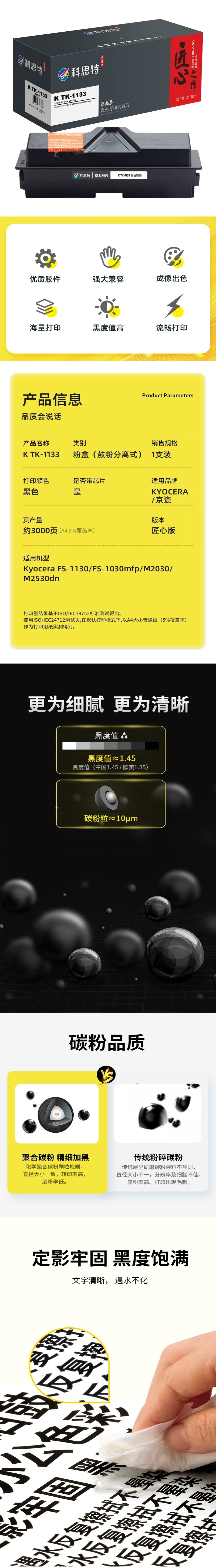 商品标题:科思特(KST)兼容K TK-1133 匠心版粉盒 黑色(适用京瓷Kyocera FS-1130/FS-1030mfp/M2030/M2530dn)打印页数:3000页(单位:支)