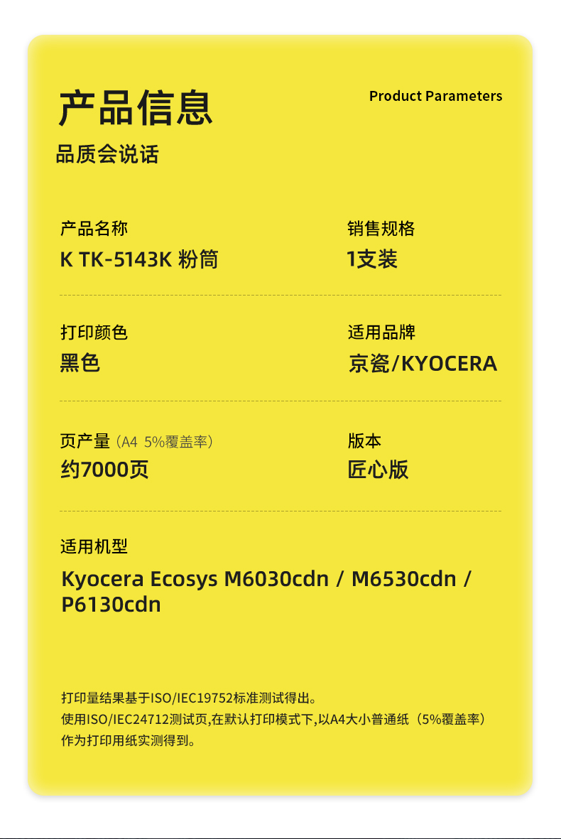 商品标题:科思特(KST)兼容K TK5143K 匠心版粉盒 黑色(适用京瓷Kyocera Ecosys M6030cdn/M6530cdn/P6130cdn)打印页数:7000页(单位:支)