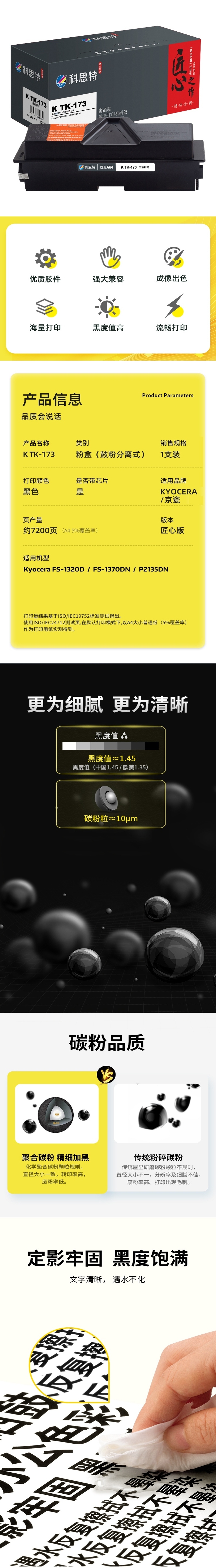 商品标题:科思特(KST)兼容K TK-173 匠心版粉盒 黑色(适用京瓷Kyocera FS-1320D/FS-1370DN/P2135DN)打印页数:7200页(单位:支)