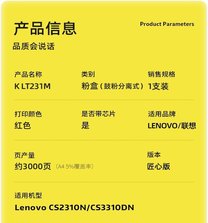 商品标题:科思特(KST)兼容K LT231M 匠心版粉盒 红色(适用联想Lenovo CS2310N/CS3310DN)打印页数:3000页(单位:支)