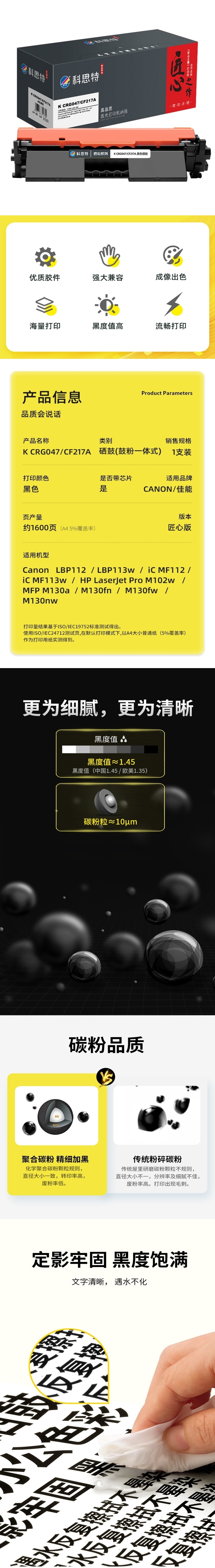 科思特(KST)兼容K CRG047/CF217A 匠心版粉盒 黑色(适用佳能Canon LBP112/LBP113w/iC MF112/iC MF113w/HP LaserJet Pro M102w/MFP M130a/M130fn/M130fw/M130nw)打印页数:1600页(单位:支)