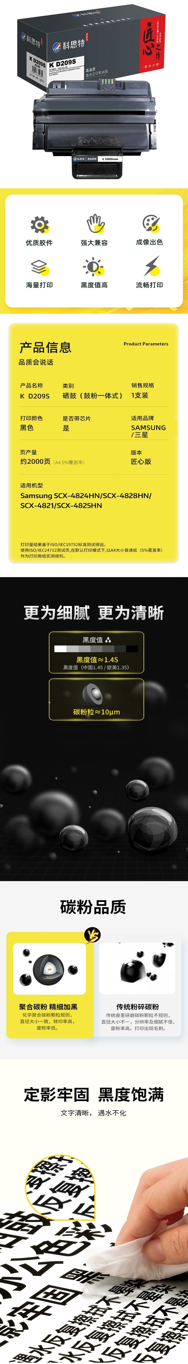 商品标题:科思特(KST)兼容K D209S 匠心版硒鼓(鼓粉一体)黑色(适用三星Samsung SCX-4824HN/SCX-4828HN/SCX-4821/SCX-4825HN)打印页数:2000页(单位:支)