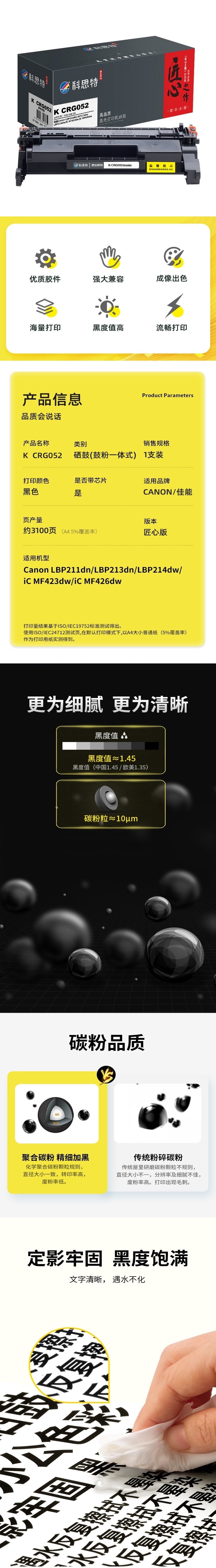 商品标题:科思特(KST)兼容K CRG052 匠心版硒鼓(鼓粉一体)黑色(适用佳能Canon LBP211dn/LBP213dn/LBP214dw/iC MF423dw/iC MF426dw)打印页数:3100页(单位:支)