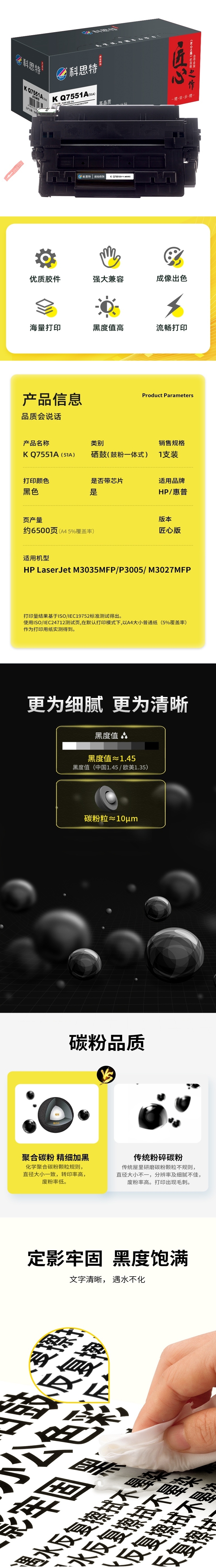 商品标题:科思特(KST)兼容K Q7551A(51A) 匠心版硒鼓(鼓粉一体)黑色(适用惠普HP LaserJet M3035MFP/P3005/M3027MFP)打印页数:6500页(单位:支)