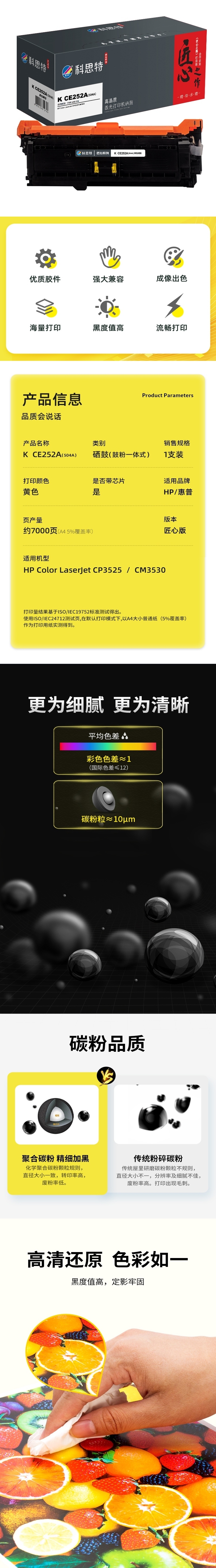 商品标题:科思特(KST)兼容K CE252A(504A) 匠心版硒鼓(鼓粉一体)黄色(适用惠普Color LaserJet CP3525/CM3530)打印页数:7000页(单位:支)