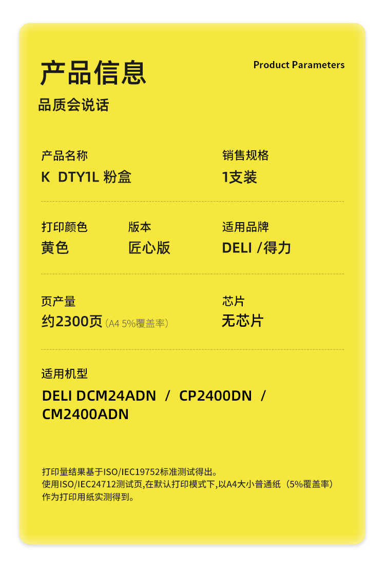 商品标题:科思特(KST)兼容K DTY1L 匠心版粉盒(鼓粉分离)黄色(适用得力DCM24ADN/CP2400DN/CM2400ADN)打印页数:2300页(单位:支)