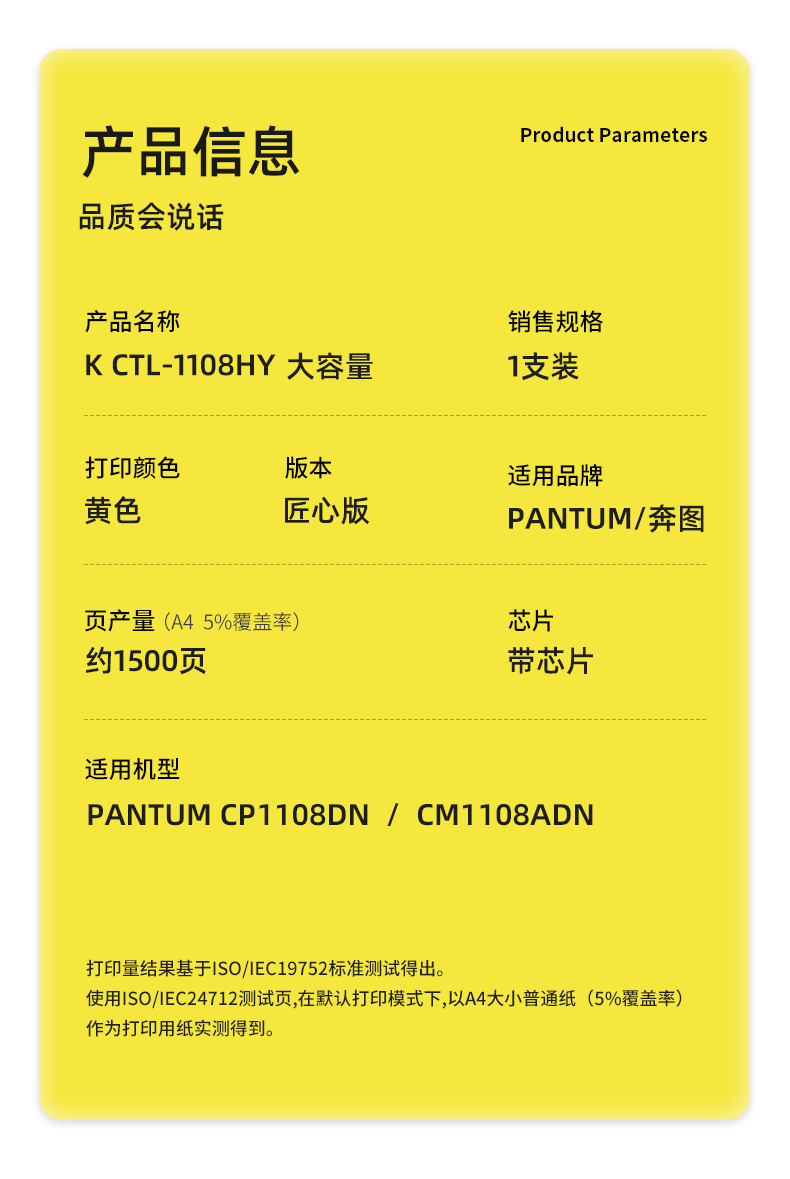 商品标题:科思特(KST)兼容K CTL-1108HY 匠心版硒鼓(鼓粉一体)黄色(适用奔图CP1108DN/CM1108ADN)打印页数:1500页(单位:支)