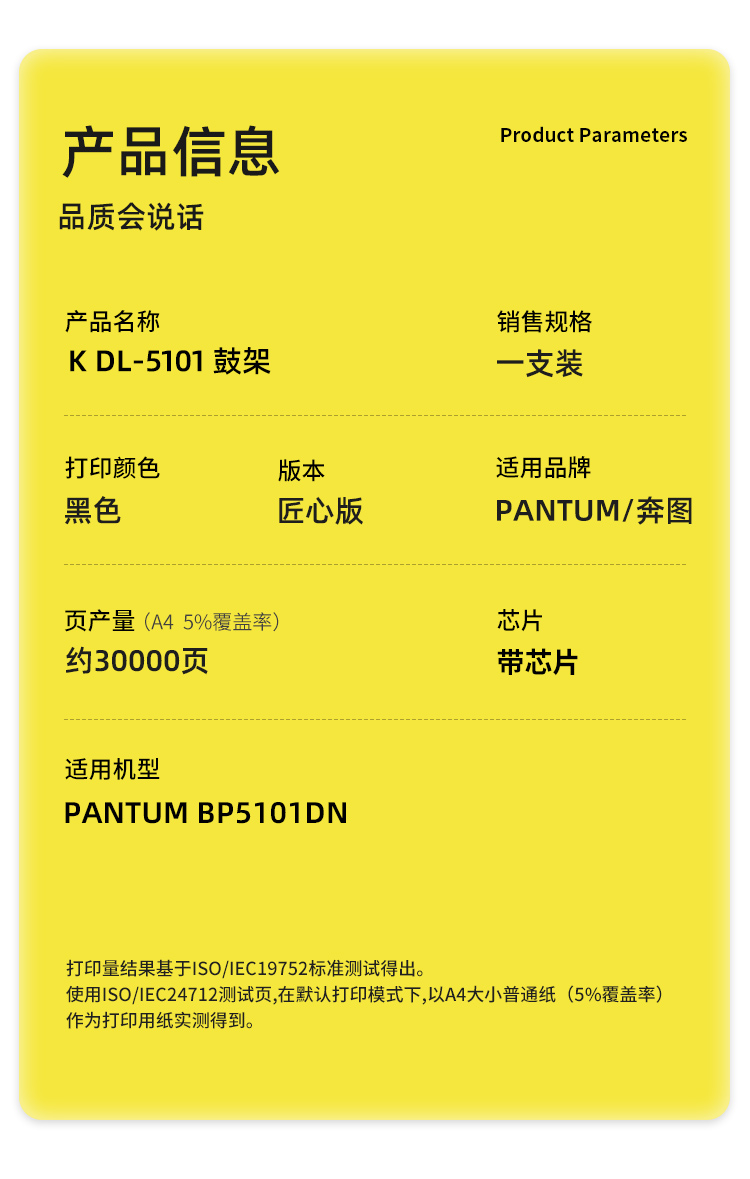 商品标题:科思特(KST)兼容K DL-5101 匠心版鼓架(鼓粉分离)黑色(适用奔图BP5101DN)打印页数:30000页(单位:支)