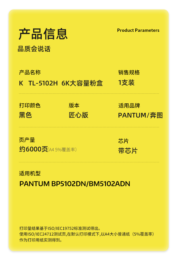 商品标题:科思特(KST)兼容K TL-5102H 匠心版粉盒(鼓粉分离)黑色(适用奔图BP5102DN/BM5102ADN)打印页数:6000页(单位:支)