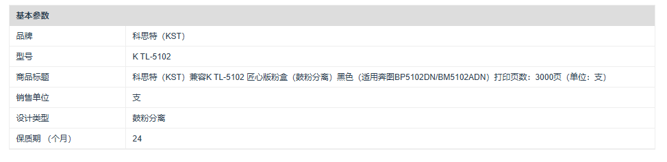 商品标题:科思特(KST)兼容K TL-5102 匠心版粉盒(鼓粉分离)黑色(适用奔图BP5102DN/BM5102ADN)打印页数:3000页(单位:支)