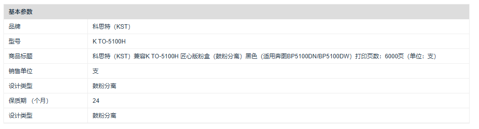 商品标题:科思特(KST)兼容K TO-5100H 匠心版粉盒(鼓粉分离)黑色(适用奔图BP5100DN/BP5100DW)打印页数:6000页(单位:支)