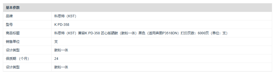 商品标题:科思特(KST)兼容K PD-358 匠心版硒鼓(鼓粉一体)黑色(适用奔图P3518DN)打印页数:6000页(单位:支)