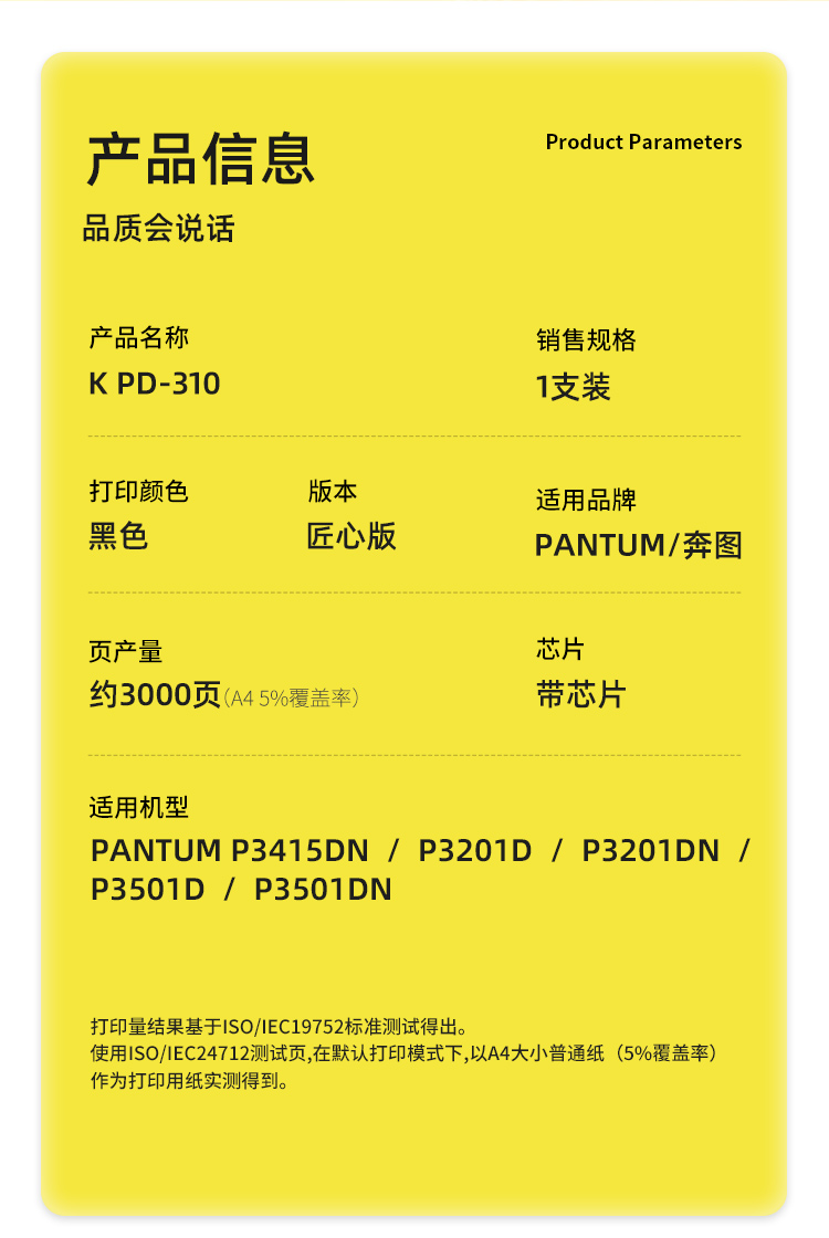 商品标题:科思特(KST)兼容K PD-310 匠心版硒鼓(鼓粉一体)黑色(适用奔图P3415DN/P3201D/P3201DN/P3501D/P3501DN)打印页数:3000页(单位:支)