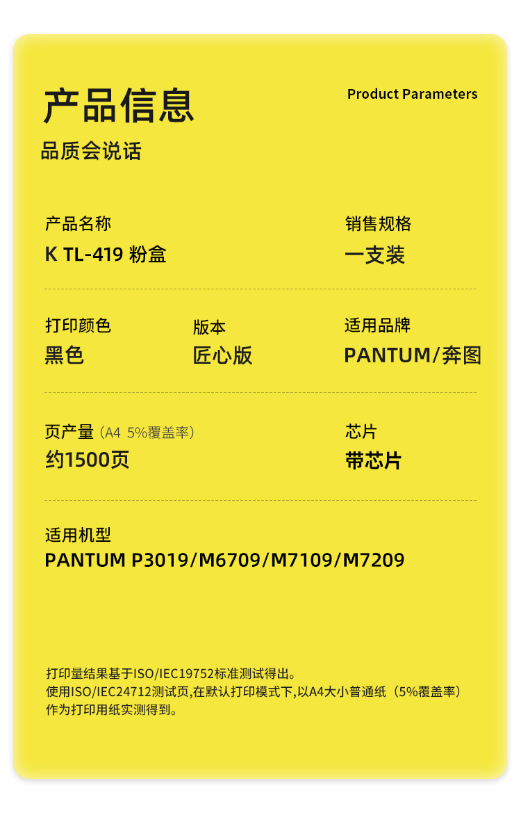 商品标题:科思特(KST)兼容K TL-419 匠心版粉盒(鼓粉分离)黑色(适用奔图P3019/M6709/M7109/M7209)打印页数:1500页(单位:支)