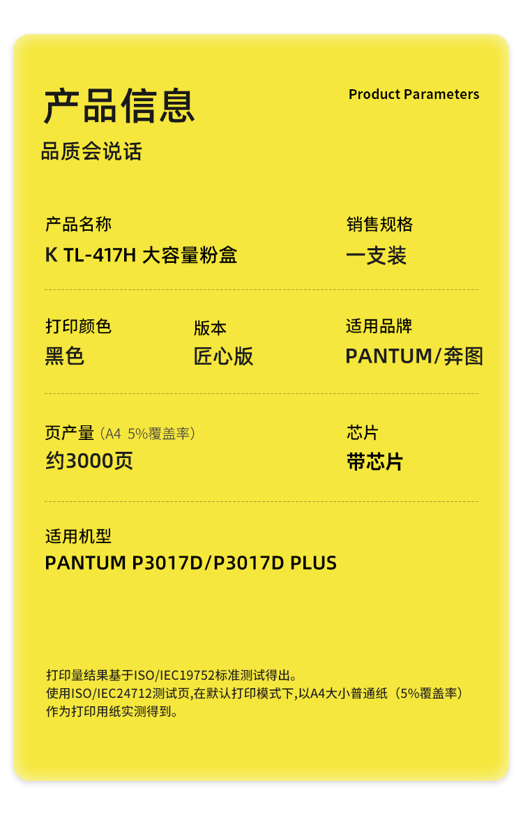 商品标题:科思特(KST)兼容K TL-417H 匠心版粉盒(鼓粉分离)黑色(适用奔图P3017D/P3017D PLUS)打印页数:3000页(单位:支)