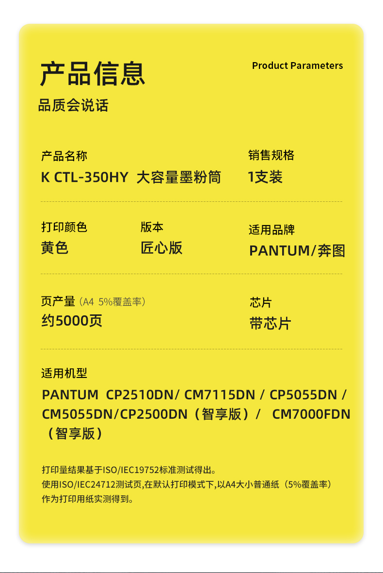 商品标题:科思特(KST)兼容K CTL-300HY 匠心版粉筒(鼓粉分离)黄色(适用奔图CP2506DN PLUS/CM7105DN)打印页数:5000页(单位:支)