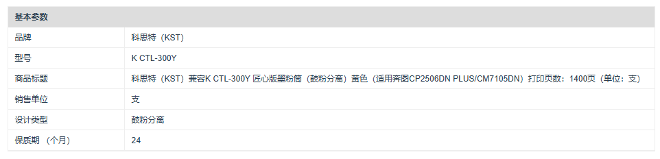 商品标题:科思特(KST)兼容K CTL-300Y 匠心版墨粉筒(鼓粉分离)黄色(适用奔图CP2506DN PLUS/CM7105DN)打印页数:1400页(单位:支)