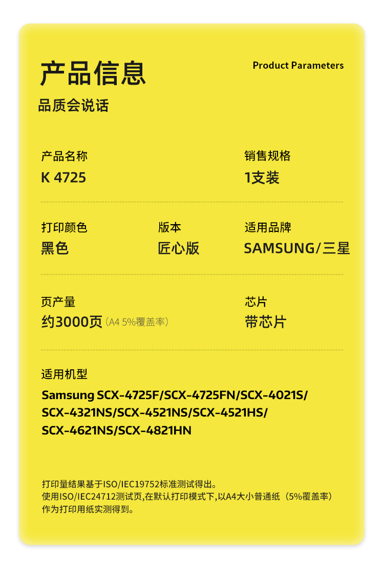 商品标题:科思特(KST)兼容K 4725 匠心版硒鼓(鼓粉一体)黑色(适用三星SCX-4725F/SCX-4725FN/SCX-4021S)打印页数:3000页(单位:支)