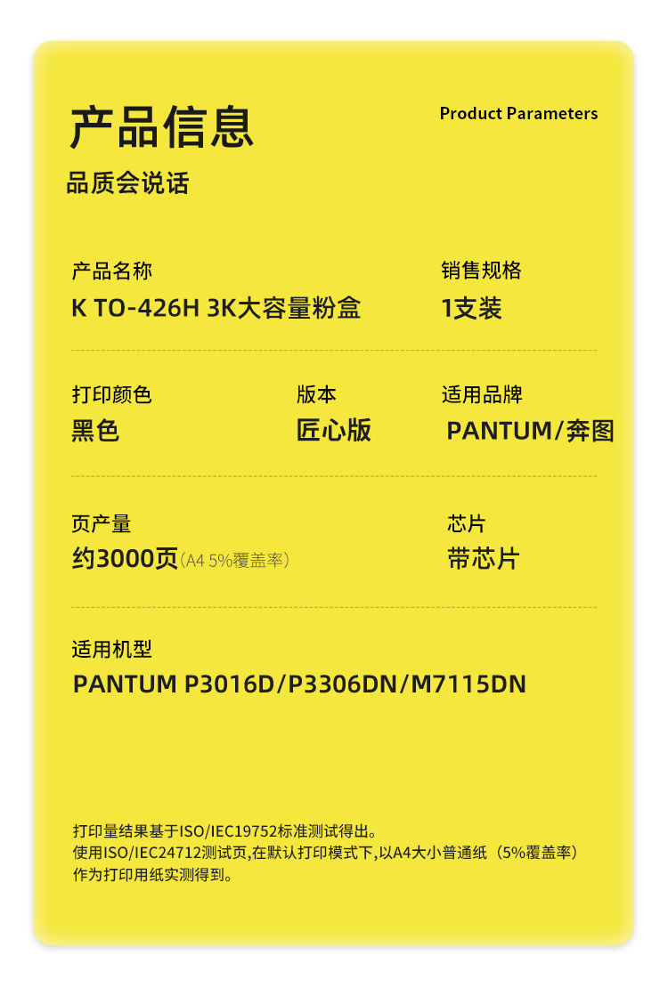 商品标题:科思特(KST)兼容K TO-426H 匠心版粉盒(鼓粉分离)黑色(适用奔图P3016D/P3306DN/M7115DN)打印页数:3000页(单位:支)