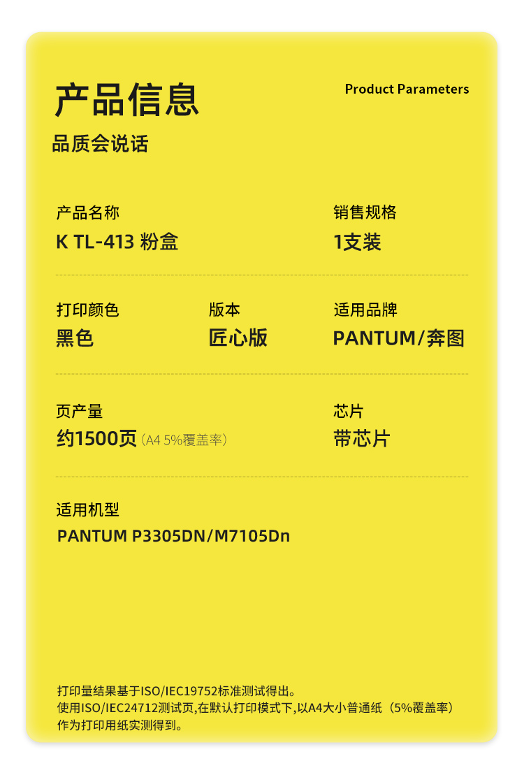 商品标题:科思特(KST)兼容K TL-413 匠心版粉盒(鼓粉分离)黑色(适用奔图P3305DN/M7105Dn)打印页数:1500页(单位:支)