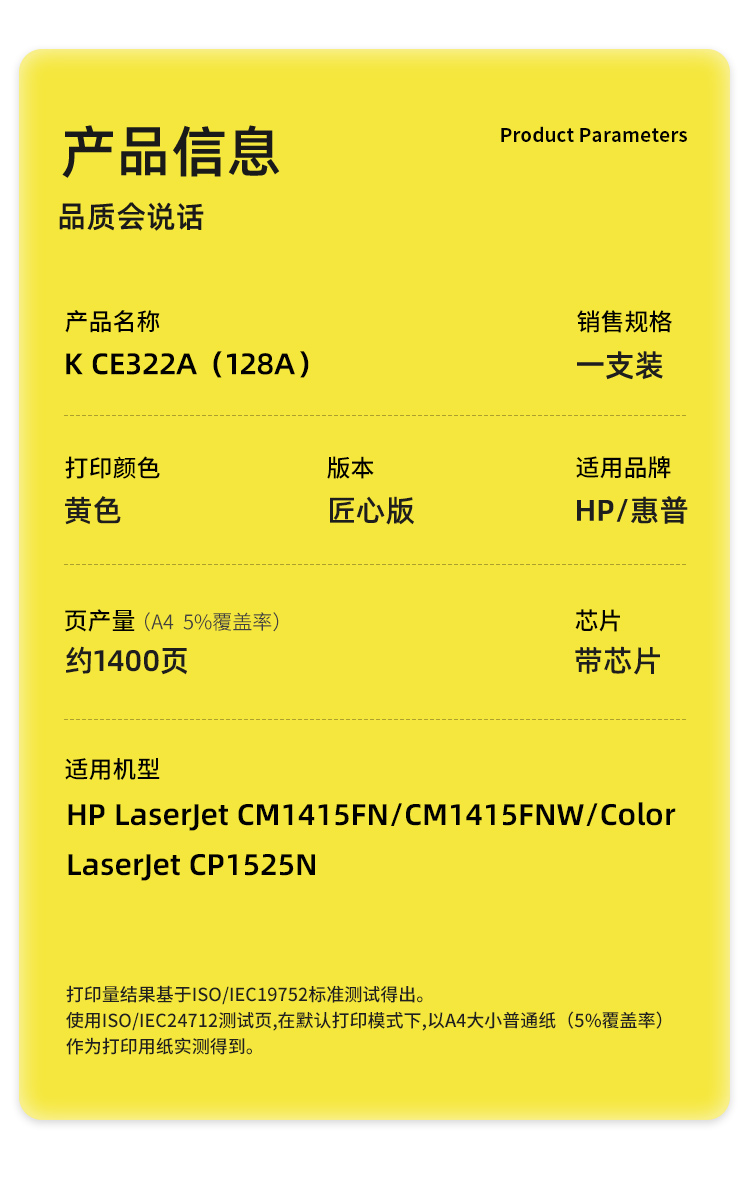 商品标题:科思特(KST)兼容K CE322A(128A)匠心版硒鼓(鼓粉一体)黄色(适用惠普 CP1520/1521n/1525N/CM1415FN)打印页数:1400页(单位:支)