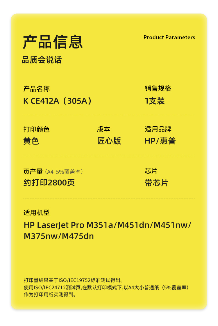 商品标题:科思特(KST)兼容K CE412A(305A)匠心版硒鼓(鼓粉一体)黄色(适用惠普M351a/M451dn/M451nw)打印页数:2800页(单位:支)
