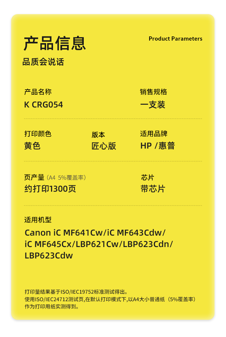 商品标题:科思特(KST)兼容K CRG054 匠心版硒鼓(鼓粉一体)黄色(适用佳能iC MF641Cw/iC MF643Cdw)打印页数:1300页(单位:支)