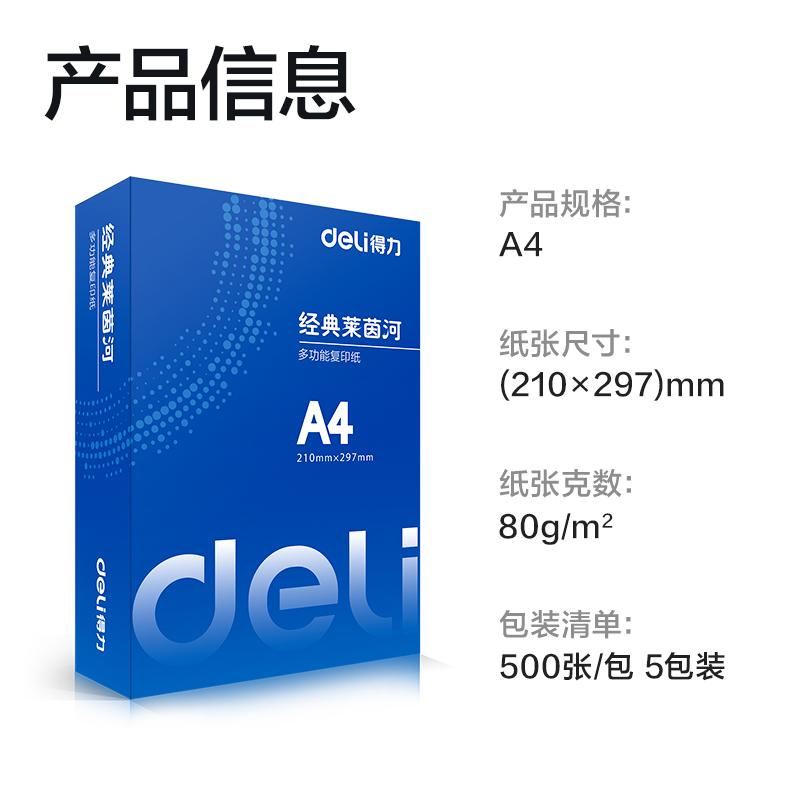 商品标题:得力7460经典莱茵河复印纸 80克A4 500张/包 5包/箱(单位:包)