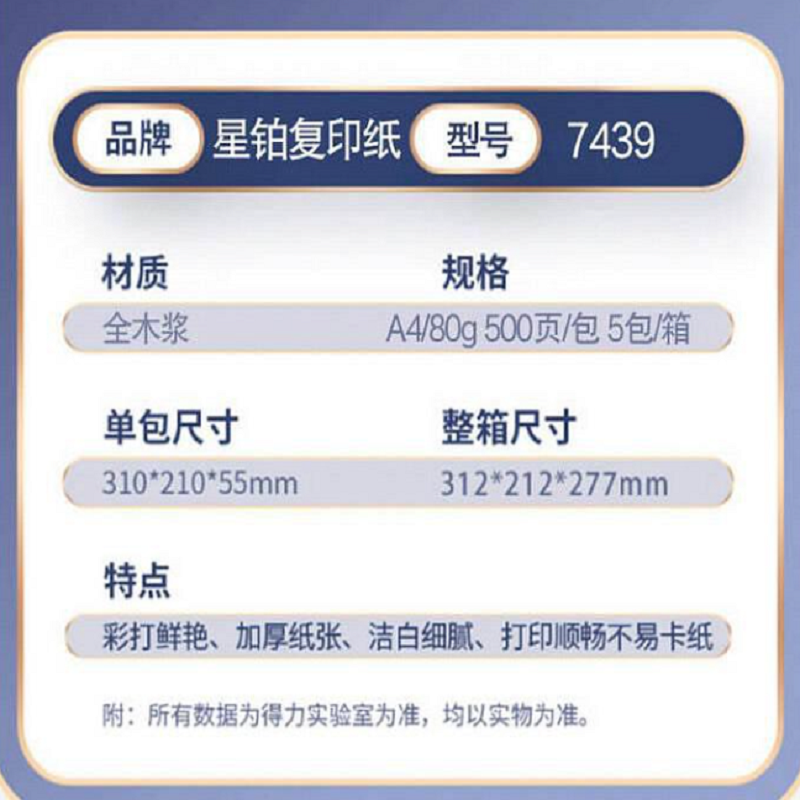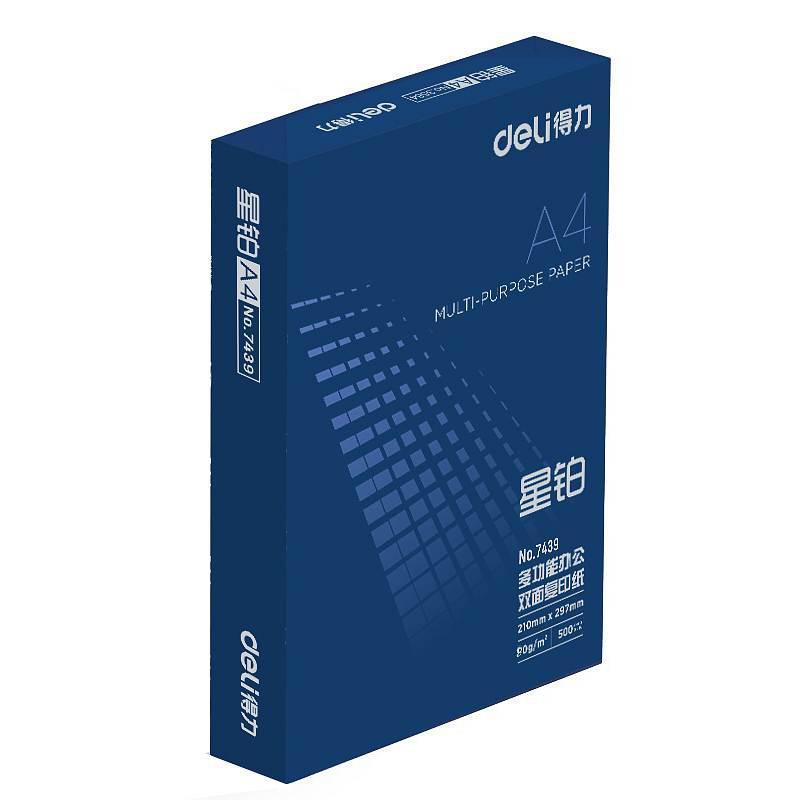 商品标题:得力7439星铂复印纸 80克A4 500张/包 5包/箱(单位:包)