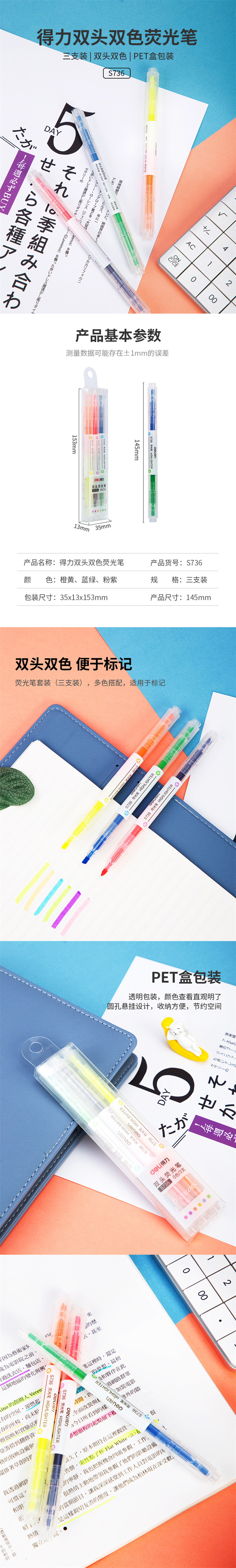 商品标题:得力S736双头双色荧光笔(混)(3支/盒)