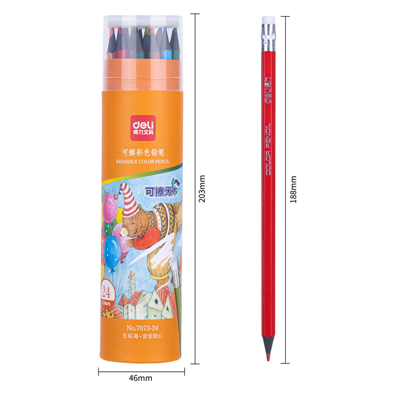 商品标题:得力7073-24色六角杆皮头可擦彩铅(混)(24色/筒)