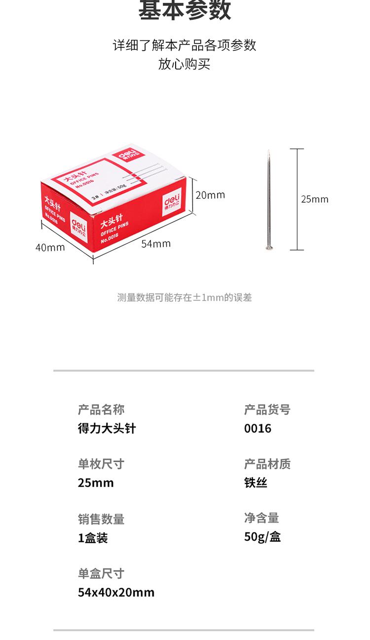 商品标题:得力(deli) 0016 大头针 50枚/盒(单位:盒)银色