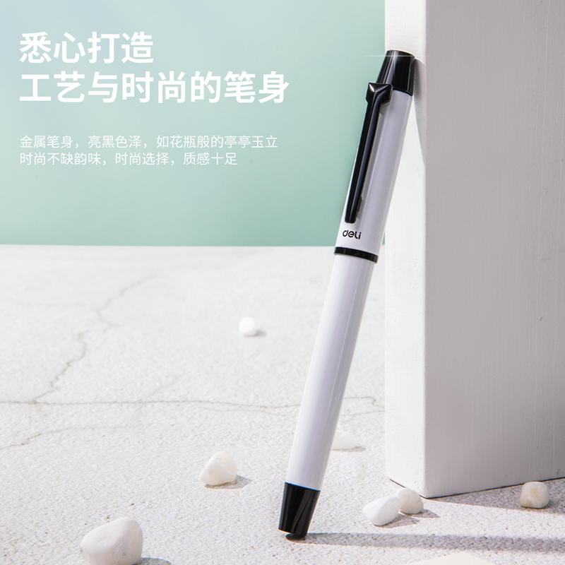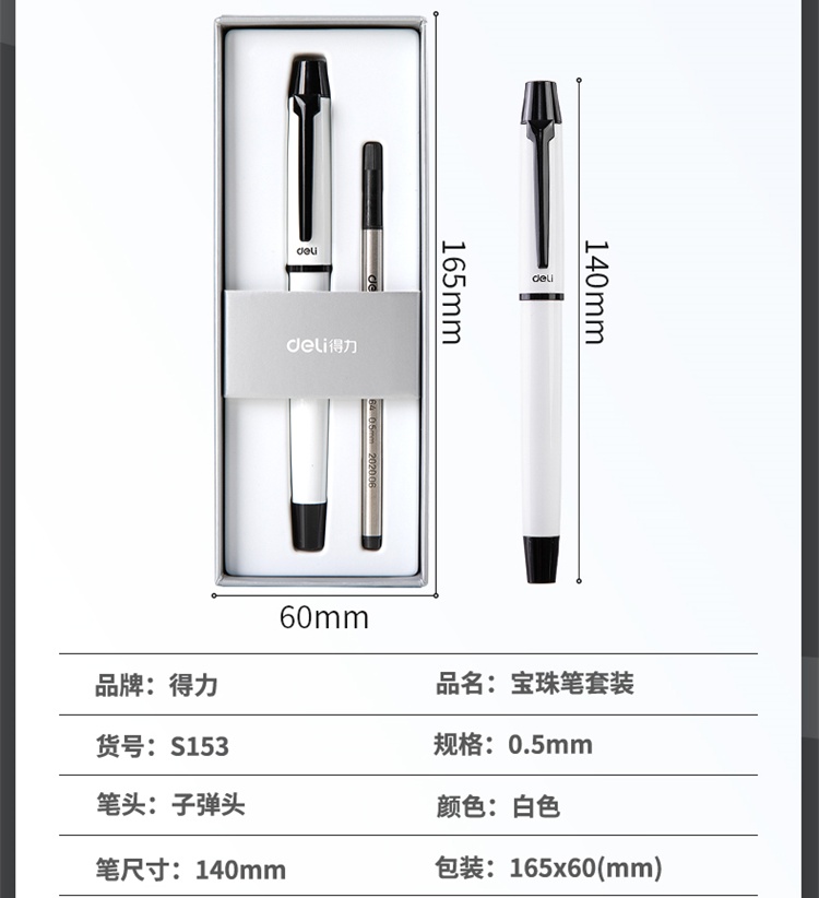 商品标题:得力S153宝珠笔套装0.5mm子弹头(白色)(1支笔+1支笔芯/盒)