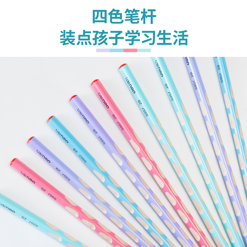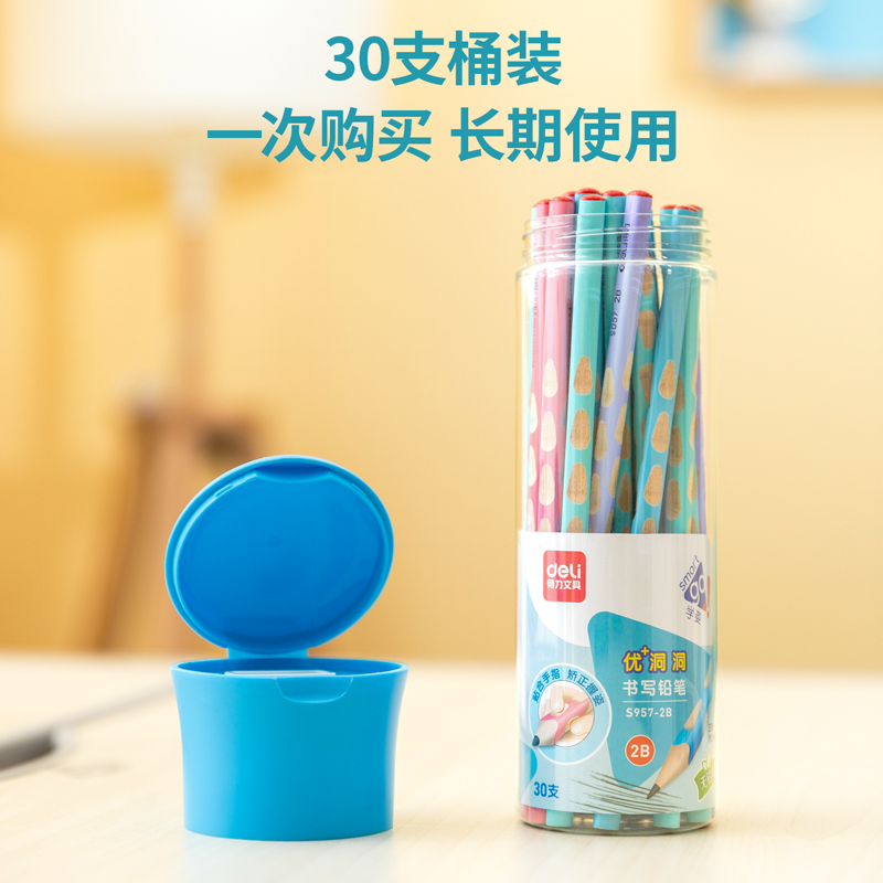 商品标题:得力S957-2B_淡彩30支桶装2B优+洞洞书写铅笔(混)(30支/桶)